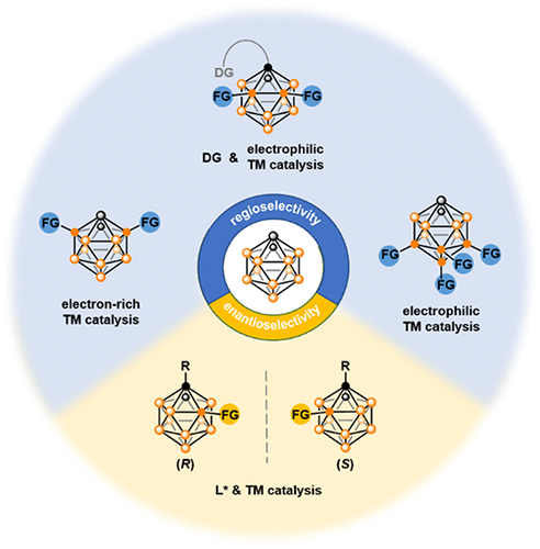 鉴于邻-碳硼烷的10个BH顶点因与碳顶点距离差异形成四组极性梯度[顶点电荷顺序为B(9,12)-H > B(8,10)-H > B(4,5,7,11)-H >> B(3,6)-H], 我们提出了一种利用金属有机化学方法解决选择性问题的通用策略,即通过匹配过渡金属催化剂的电子特性(如富电子/缺电子金属)与碳硼烷顶点电荷梯度。 该策略的成功应用推动了一系列选择性催化笼B-H功能化方法的发展,从而以区域选择性和催化方式制备了各种笼B功能化的碳硼烷衍生物。 同时,通过对映选择性B-H活化/功能化可以实现笼手性邻-碳硼烷的不对称合成。